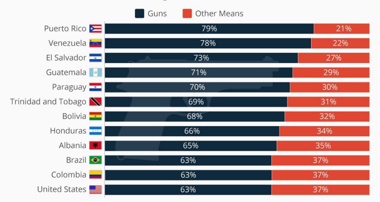 در اینفوگرافی زیر ۱۲ کشوری که رتبه بندي دارای بیشترین قرباني خشونت با سلاح گرم در سال ۲۰۱۶ هستند را می بینید. در این رتبه بندی پورتوریکو در جایگاه اول خشونت قرار دارد.