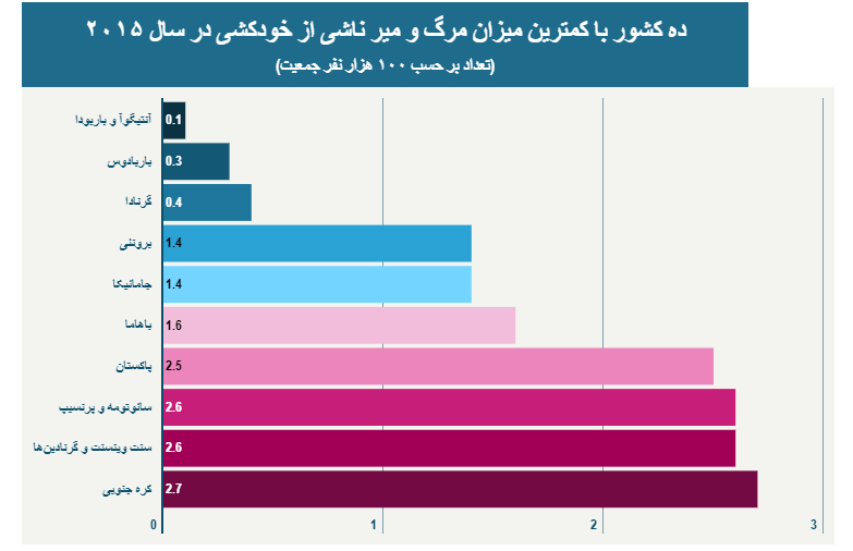 آنتیگوآ و باربودا (منطقه آمریکا)، باربادوس (منطقه آمریکا)، گرنادا (منطقه آمریکا)، برونئی (منطقه اقیانوس آرام غربی)، جامائیکا (منطقه آمریکا)، باهاما (منطقه آمریکا)، پاکستان (منطقه مدیترانه شرقی)، سائوتومه و پرنسیپ (منطقه آفریقا)، سنت وینسنت و گرنادینها (منطقه آمریکا) و گواتمالا (منطقه آمریکا) ده کشور یا منطقه با کمترین میزان مرگ و میر ناشی از خودکشی به نسبت جمعیت خود در جهان هستند.