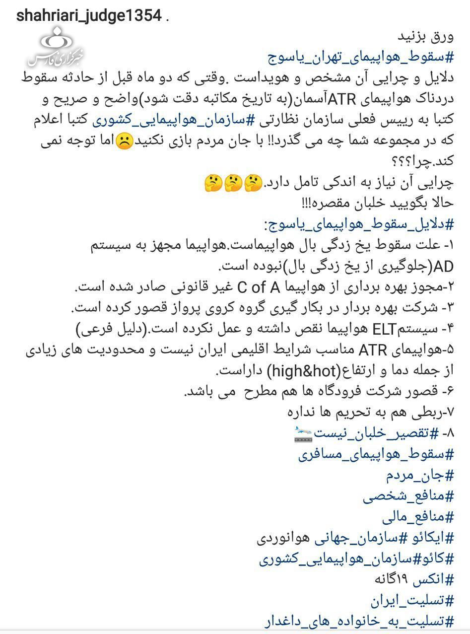 قاضی شهریاری سرپرست دادسرای امور جنایی تهران در خصوص حادثه سقوط هواپیمایی یاسوج نوشت: دلایل و چرایی این حادثه مشخص و هویداست.