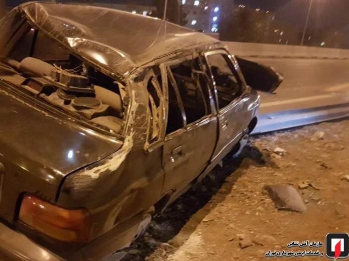 یک دستگاه خودروی پراید پس از برخورد شدید با گاردریل وسط بزرگراه، با سقف بر روی حفاظهای فلزی افتاد و به حالت نیمه واژگون درآمد.