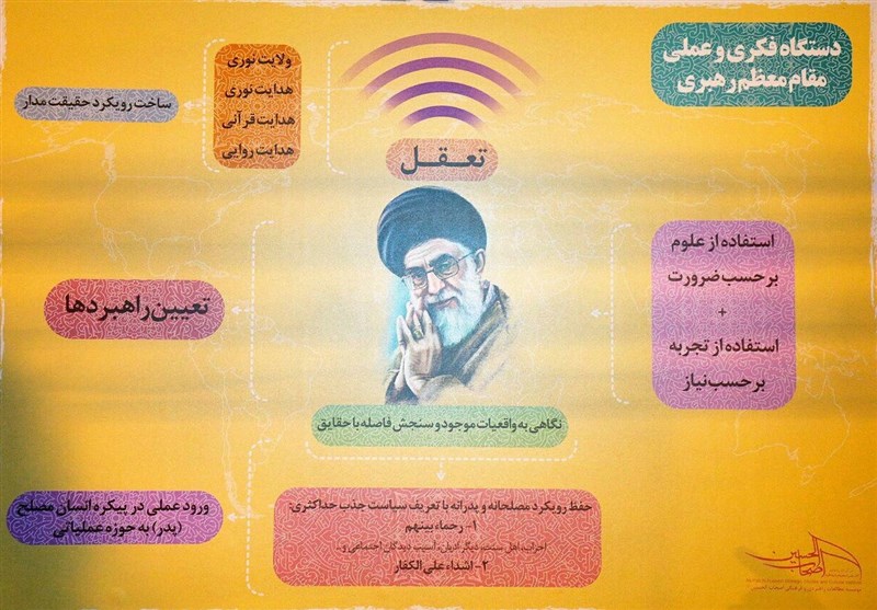 ما یک تصویری در اینجا داریم که مشاهده می کنید. این تصویر دستگاه فکری و عملی امام و رهبری را نشان میدهد. در این تصویر، به اندیشه امام و رهبری به مثابه یک دستگاه عظیم که حاصل جریان ولایت خداست، نگاه می شود. در این تصویر در سه بخش به اندیشه امام و رهبری توجه شده است، فضای اول فضای جریانات الهی است که بر یک ولی الهی سایه میافکند یعنی همان جریان ولایت الله و اولی الامر. مجموعه وسط، مجموعه دانشها و تجربههاست. تا جایگاه دانشها و تجربه به نسبت هدایت الهی روشن نشود آنگاه فهم دقیقی از اندیشه و عمل امام و رهبری صورت نخواهد گرفت. دانش فلسفه، فقه، کلام، حدیث و... حاکم بر امام و رهبری نبوده بلکه محل توجه و استفاده بسیاری برای آن بزرگواران بوده است. آن چیزی که بر امام و رهبری حاکم بوده و هست، ولایت الهی است.