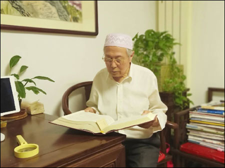 (یکی از مسلمانان شهر پکن در ماه رمضان در خانه خود قرآن می خواند)