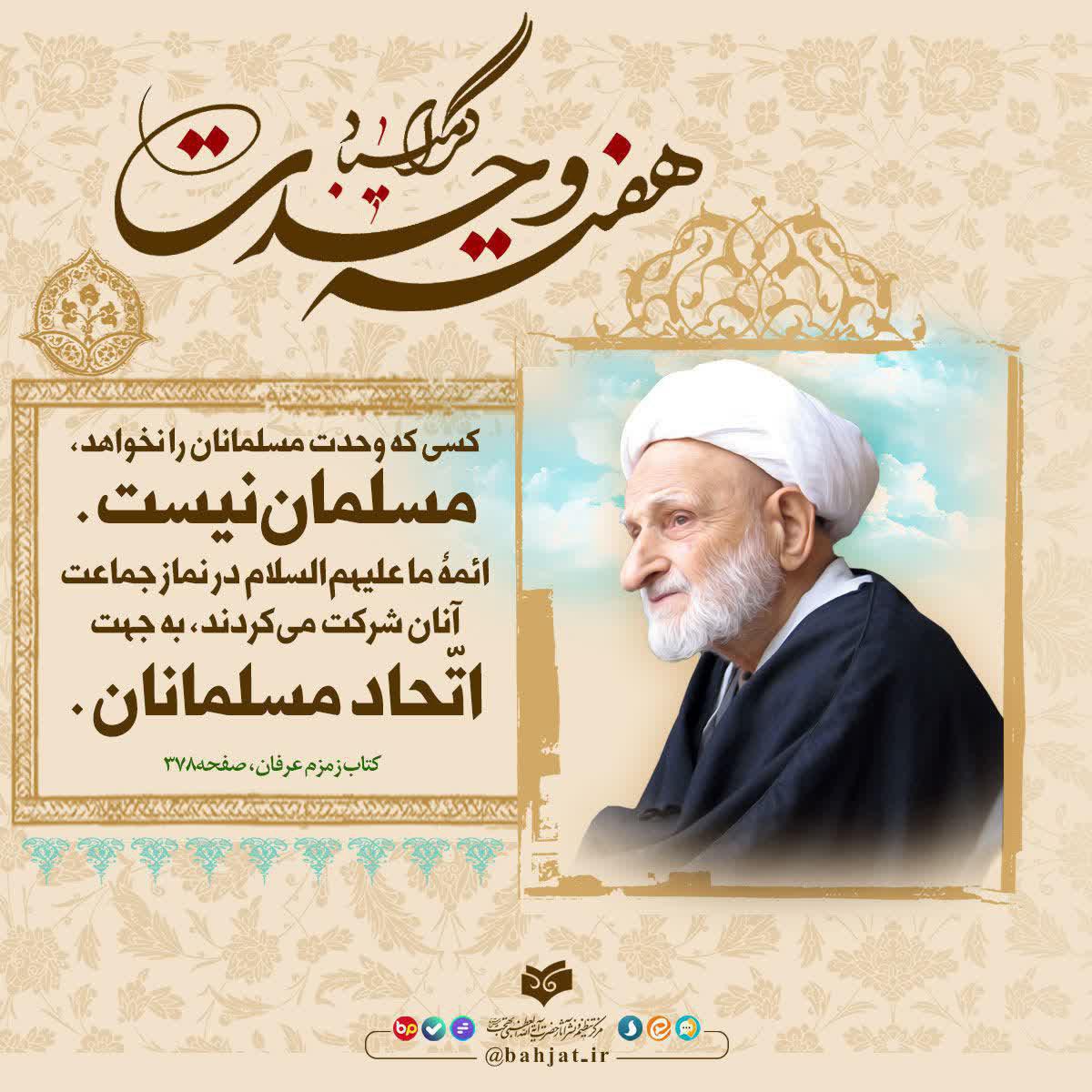 حضرت آیت‌الله بهجت(ره): کسی که وحدت مسلمانان را نخواهد، مسلمان نیست. ائمۀ ما علیهم‌السلام در نماز جماعت آنان شرکت می‌کردند، به جهت اتّحاد مسلمانان.