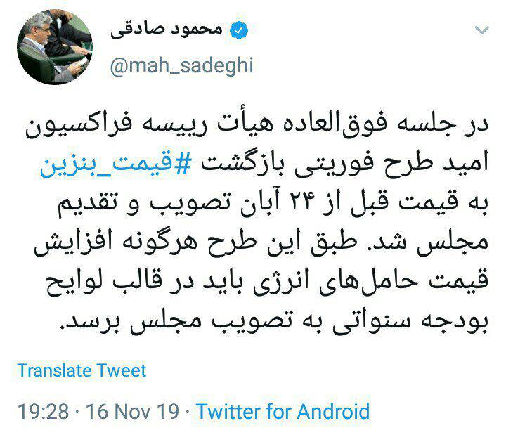 محمود صادقی نماینده مجلس گفت: طرح فوریتی فراکسیون امید برای بازگشت قیمت بنزین به قبل ۲۴ آبان تصویب و تقدیم مجلس شد.