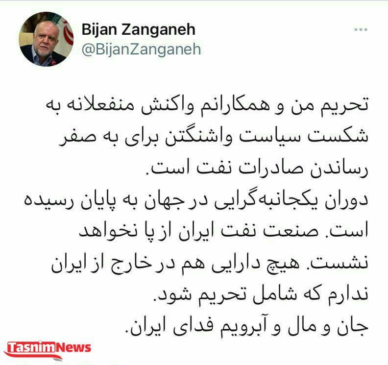 واکنش «وزیر نفت» به تحریمش توسط آمریکا/ جان و مال و آبرویم فدای ایران