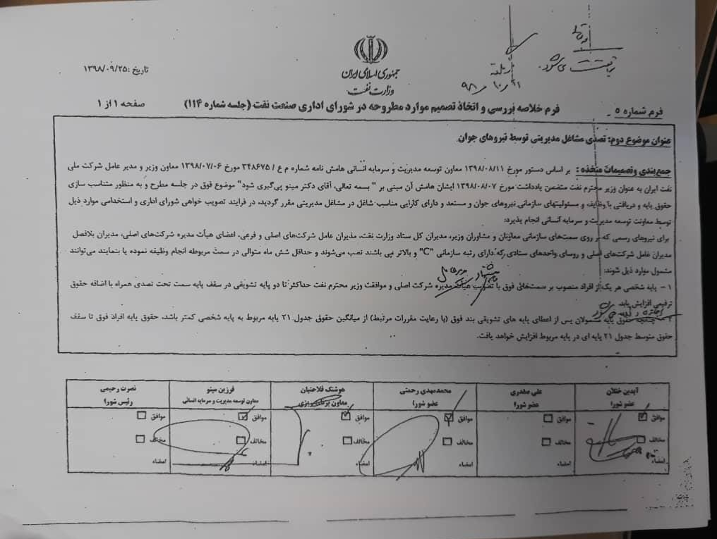 وی ادامه داد: «اما طبق مقررات، مصوبات اجرایی که دارای بار مالی در صنعت نفت هستند، حتماً یک طرف آن را باید سازمان اداری استخدامی امضا کند و در حقیقت رای وزیر اصل و رای معاونین وزیر نفت تایید رای وزیر بوده و جنبه زینتی دارد و اگر سازمان اداری استخدامی مصوبات را امضا نکند، با استناد به اکثریت آرا نمیتوان آنرا اجرا کرد، بلکه اتفاق آرا یا دو امضا طلایی وزیر نفت و سازمان اداری استخدامی مهم هستند».