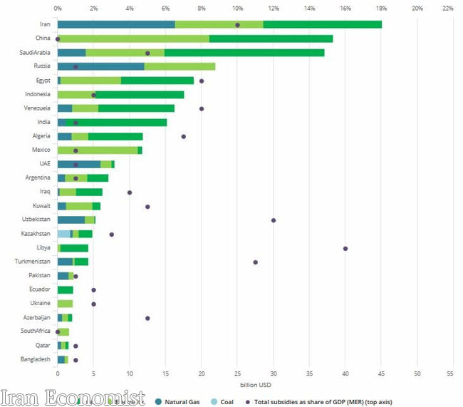 حال اگر آمار منتشر شده از سوی این آژانس برای ایران را نگاه کنیم، متوجه میشویم به طور کلی دولت ۴۵ میلیارد دلار یارانه بابت توزیع انرژی در سال ۲۰۱۷ پرداخت کرده است که با ده درصد از تولید ناخاص داخلی (GDP) برابری میکند.
