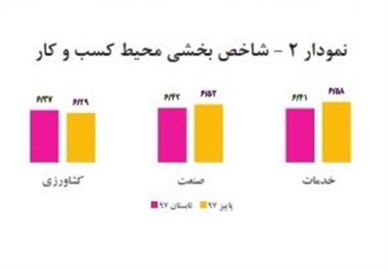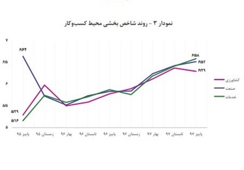 بر اساس نتایج این پایش در پاییز 1397، وضعیت محیط کسب و کار در بخش خدمات در مقایسه با بخش‌های کشاورزی و صنعت نامناسب‌تر ارزیابی شده است و در بین رشته فعالیت‌های اقتصادی نیز، رشته‌ فعالیت‌های 1- اداری و خدمات پشتیبانی، 2- سلامت انسان و مددکاری اجتماعی و 3- عمده‌فروشی و خرده‌فروشی، تعمیر وسایل و غیره (صادرات و واردات)، به ترتیب دارای بدترین وضعیت کسب و کار و رشته فعالیت‌های 1- مالی و بیمه، 2- هنر، سرگرمی و تفریح و 3- آموزش، به ترتیب بهترین وضعیت کسب و کار را در مقایسه با سایر رشته فعالیت‌های اقتصادی در کشور داشته‌اند.