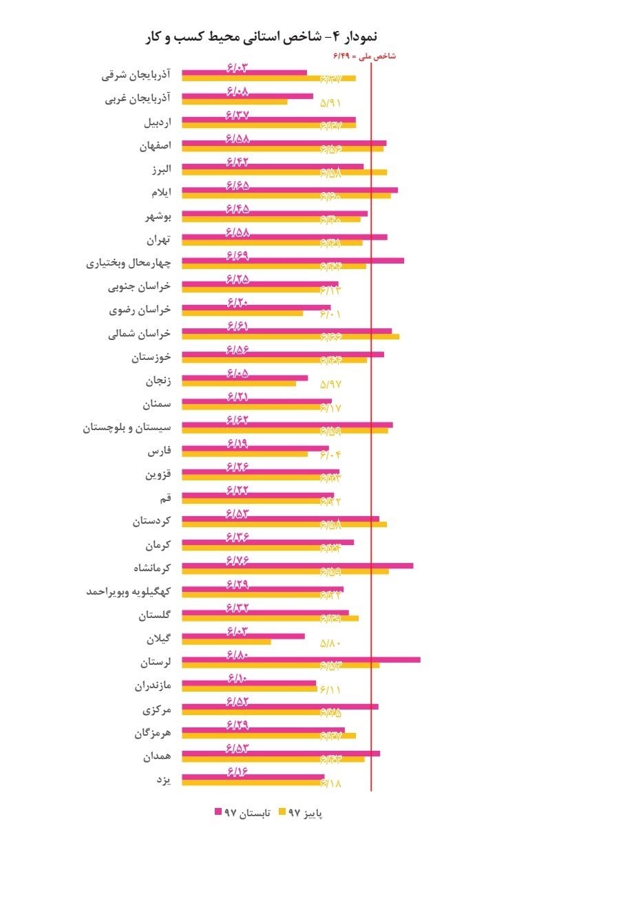 بر اساس پایش محیط کسب و کار ایران در پاییز ۹۷، استان‌های خراسان شمالی، ایلام و کرمانشاه به ترتیب دارای بدترین وضعیت محیط کسب و کار و استان‌های گیلان، آذربایجان غربی و زنجان به ترتیب دارای بهترین وضعیت محیط کسب و کار هستند.