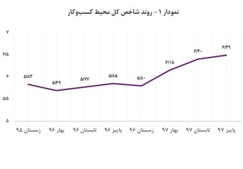 در پاییز 1397، فعالان اقتصادی مشارکت‌کننده در این پایش، سه مؤلفه 1- غیرقابل پیش‌بینی بودن و تغییرات قیمت مواد اولیه و محصولات 2- بی‏ ثباتی سیاست‌ها، قوانین و مقررات و رویه‌های اجرایی ناشر به کسب و کار و 3- دشواری تأمین مالی از بانک‌ها را نامناسب‏ترین و سه مؤلفه : 1- محدودیت‌ دسترسی به حامل‌های انرژی 2- محدودیت‌ دسترسی به آب و 3- محدودیت‌های دسترسی به شبکه تلفن همراه و اینترنت را مناسب‏ترین مؤلفه‏ های محیط کسب وکار کشور نسبت به سایر مؤلفه‏‌ها ارزیابی کرده‌اند.