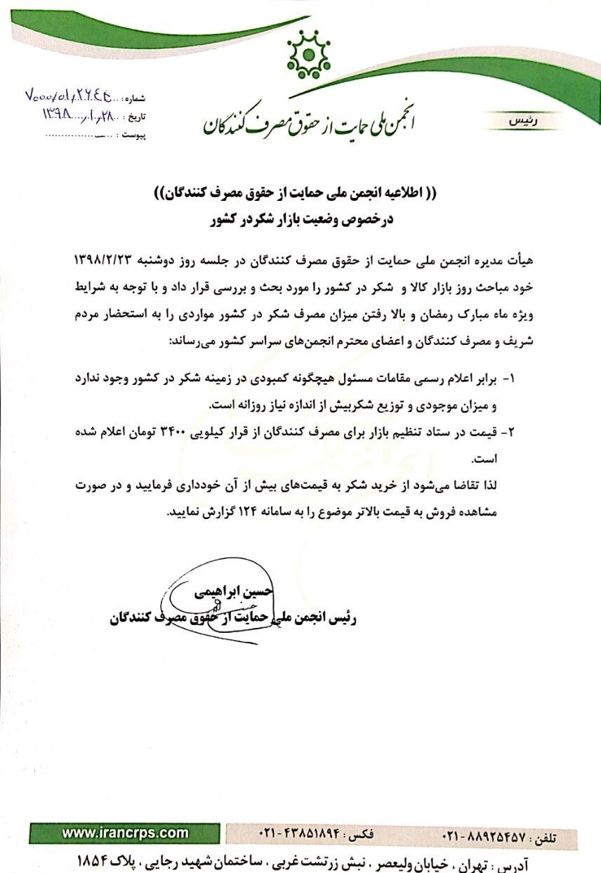 همچنین قیمت در ستاد تنظیم بازار برای مصرف کنندگان از قرار کیلویی 3400 تومان اعلام شده است لذا تقاضا میشود از خرید شکر به قیمتهای بیشتر خودداری کنید".
