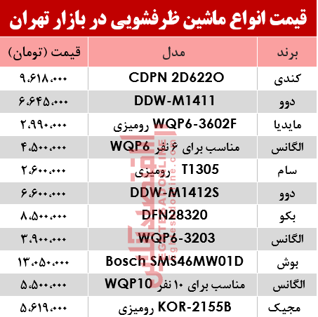 آنچه در زیر میآید جدول قیمت جدیدترین انواع ماشینهای ظرفشویی در سطح بازار تهران است.
