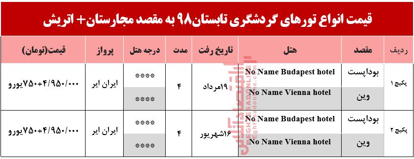قیمت انواع تورهای گردشگری به مقصد اتریش و مجارستان در تابستان۹۸ به شرح جدول زیر است.