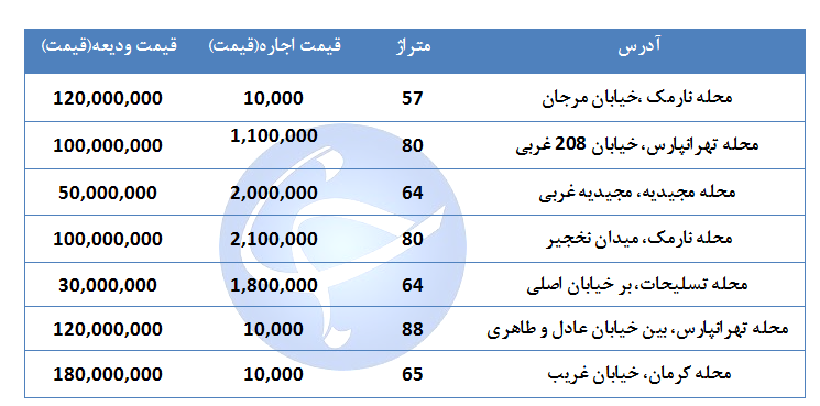 لیست آپارتمان های مسکونی اجارهای در منطقه ۸ تهران به شرح زیر است. توجه کنید که قیمتها بر حسب مترمربع به تومان بوده و تقریبی است، چراکه قیمت مسکن در تهران با توجه به نوع ساختمان، امکانات، خیابان و یا نظر مالک تغییر میکند.