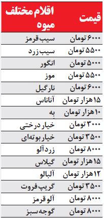 به گزارش خبر فوری به نقل از اعتماد ، در میان اقلام تازه و میوههای بهاری هر کیلوگرم زرد آلو ٨ هزار تومان، گیلاس ۱۳ هزار تومان و آلبالو کیلویی ۱۲ هزار تومان بهطور متوسط در بازار عرضه میشود. میوههای نوبرانهای که هنوز قیمت آنها شکسته نشده است و برخی از اقلام مانند گوجهسبز کیلویی ٨ هزار تومان و توتفرنگی کیلویی ۱۲ هزار تومان قیمت دارد. در میان دیگر اقلام میوه، سیب قرمز کیلویی ٦ هزار تومان، سیب زرد کیلویی ۵۵۰۰ تومان، انگور ٥ هزار تومان، موز ۵۵۰۰ تومان، نارگیل ٦ هزار تومان، آناناس ۱۵ هزار تومان، گریپ فروت کیلویی ۳۵۰۰ تومان، آلو قرمز کیلویی ٨ هزار تومان، خیار درختی کیلویی ۳۰۰۰ تومان و خیار بوتهای کیلویی ۳۵۰۰ تومان، عرضه میشود. در میان اقلام مختلف تربار سیبزمینی کیلویی ٢ هزار تومان، پیاز کیلویی ۱۵۰۰ تومان، گوجهفرنگی کیلویی ۳۵۰۰ تومان، لیموترش کیلویی ۱۰ هزار تومان، فلفل دلمهای ٣ هزارتومان و بادمجان کیلویی ۱۸۰۰ تومان قیمت دارد. در میان سایر اقلام میوه چغندر کیلویی ٢ هزار تومان، هندوانه ۱۰۰۰ تومان، کاهو کیلویی ٢ هزار تومان و هویج کیلویی ٢ هزار تومان فروخته میشود.