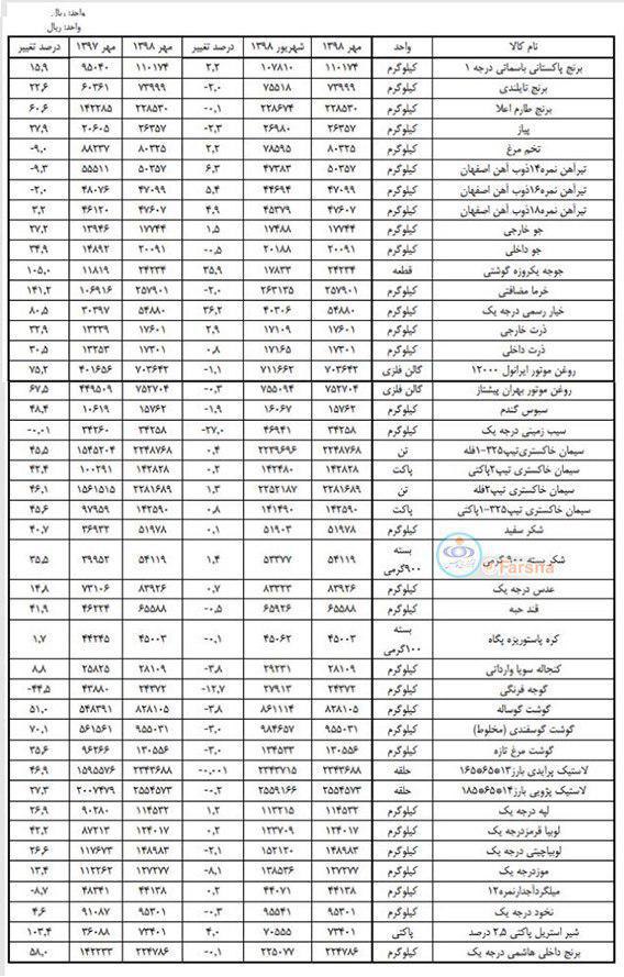 قیمت کالای اساسی در مهر ٩٨ نسبت به مهر ٩٧ چقدر تغییر کرد؟ برای پاسخ به این سوال جدول زیر را ببینید.