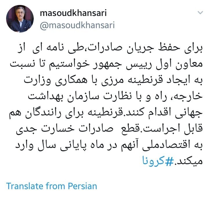 "برای حفظ جریان صادرات، طی نامهای از معاون اول رئیس جمهور خواستیم تا نسبت به ایجاد قرنطینه مرزی با همکاری وزارت خارجه، راه و با نظارت سازمان بهداشت جهانی اقدام کنند. قرنطینه برای رانندگان هم قابل اجراست. قطع صادرات خسارت جدی به اقتصاد ملی آنهم در ماه پایانی سال وارد میکند."