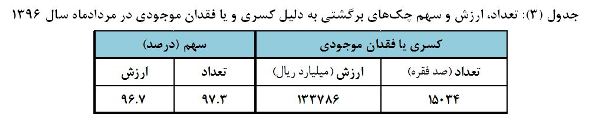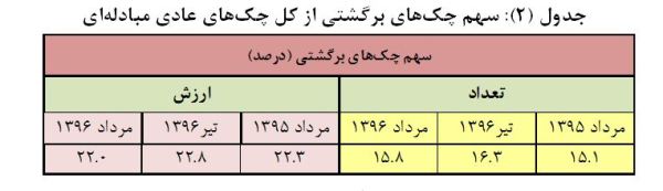 در جدول (۱) تعداد و ارزش کل چکهای عادی مبادلهای و چکهای برگشتی در مردادماه سال ۱۳۹۶ منعکس شده است.