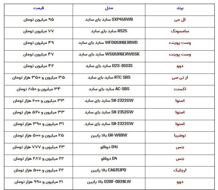 یخچال فریزر گران قیمت موجود در بازار لوازم خانگی، قیمتی بین ۹۵ میلیون تومان تا ۲۱ میلیون و ۹۹۰ هزار تومان دارند. ۱۰ یخچال فریز ابتدایی جدول زیر همگی ساید بای ساید و دیگر یخچال‌ها مدل بالا پایین و دوقلو هستند.