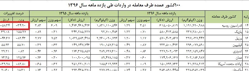 همچنین واردات از ایالات متحده نیز در حالی با کاهش 40 درصدی مواجه شده که در 11 ماهه منتهی به بهمن ماه سال قبل 215 میلیون دلار کالا از این کشور وارد ایران شده بود. واردات از آمریکا در سال جاری 31 هزار تن و ارزش ان 150 میلیون دلار بوده است.