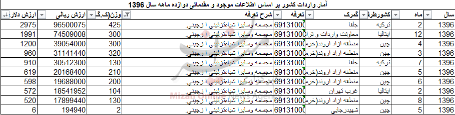 آمار مقدماتی گمرک از تجارت خارجی در سال ۹۶ حاکی از آن است که در این مدت بیش از ۲ تن انواع مجسمه و اشیا زئینتی از چینی وارد کشور شده است.