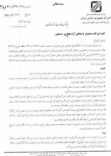 در این دستورالعمل آمده است: در اجرای تبصره بند 2 راهکارهای عملیاتی ذیل بخش (ب) مصوبه شماره 118416/ت 50193 هـ مورخ 8/9/94 هیأت محترم وزیران در خصوص استقرار گمرک در مبادی ورودی و خروجی مناطق آزاد، به پیوست تصویر صورتجلسه مورخ 30/2/97 فی مابین گمرک ایران و دبیرخانه شورایعالی مناطق آزاد و ویژه اقتصادی ارسال می گردد. مقتضی است دستور فرمایند با رعایت مفاد بندهای ذیل نسبت به اجرای صورت جلسه یاد شده ضمن رعایت سایر مقررات مربوطه اقدام لازم معمول دارند: