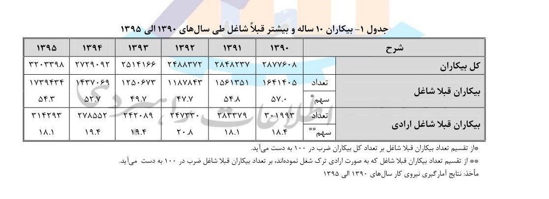 نتایج طرح آمارگیری نیروی کار سال 1395 مرکز آمار ایران نشان می دهد که از حدود 3.2 میلیون نفر بیکار 10 ساله و بیشتر در کشور، حدود 1.7 میلیون نفر 54.3 درصد قبلاً شاغل بوده اند که در این میان تعداد 314293 نفر18.1 درصد به صورت ارادی و تعداد 1425141 نفر 81.9 درصد به صورت غیر ارادی شغل خود را ترک کرده اند .