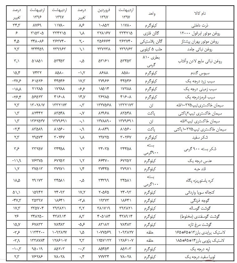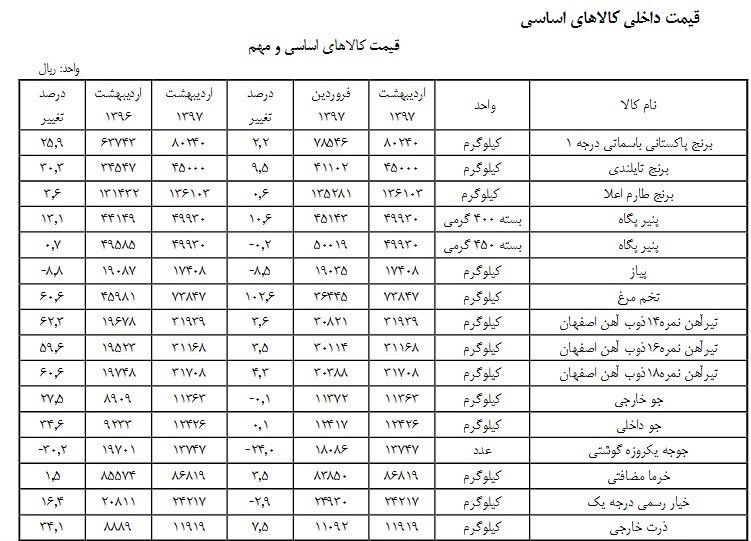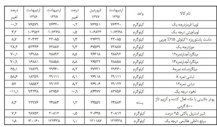 جزئیات تغییرات قیمتی انواع کالاهای اساسی در اردیبهشت ماه سال جاری به شرح زیر است: