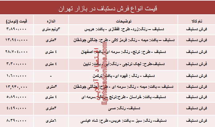 قیمت برخی از انواع فرش دستباف در بازار تهران به شرح جدول زیر است؛