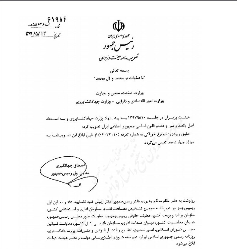 تصویر مصوبه هیئت وزیران با امضای معاون اول رئیس جمهور درباره تعرفه واردات تخم مرغ در ذیل مطلب آمده است.
