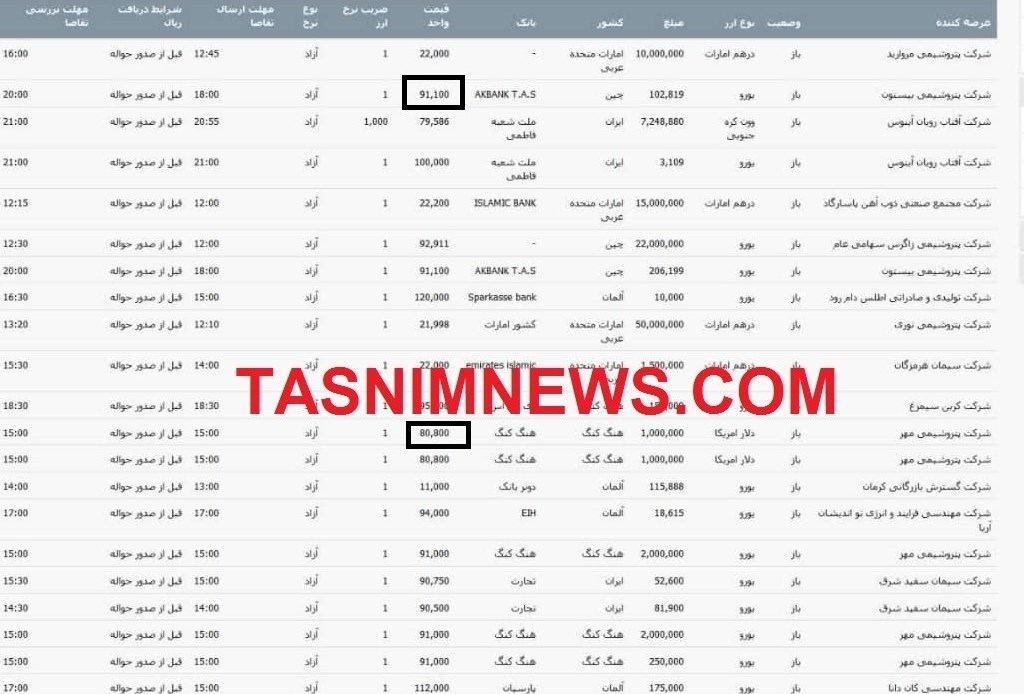 همچنین پتروشیمی بیستون 102هزار یورو به نرخ 9110 تومان در کشور چین به بازار ثانویه ارزی تزریق کرده است. در حال حاضر حداقل نرخ درهم در بازار ثانویه حدود 2200 تومان میباشد. اطلاعات عرضه ارز در بازار ثانویه در روز جاری در جدول زیر قابل مشاهده میباشد.