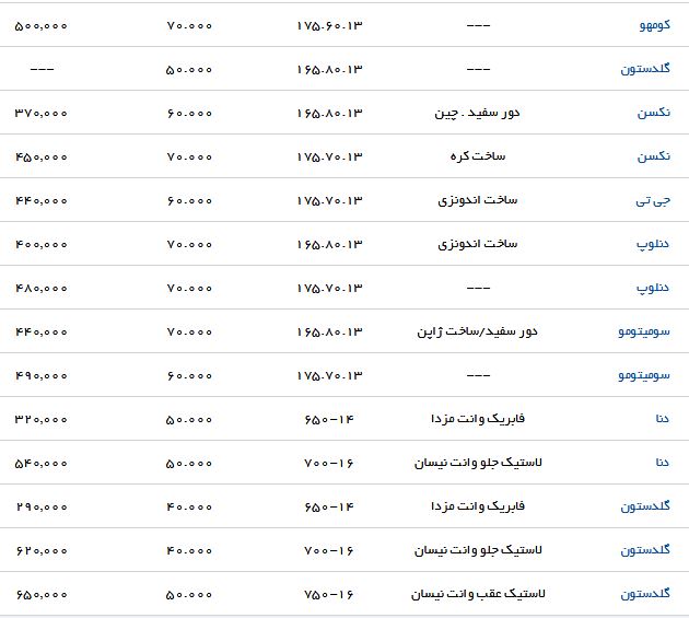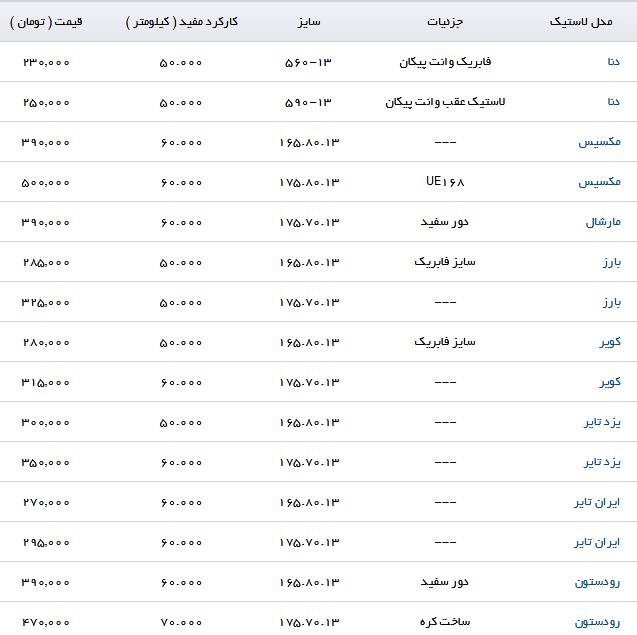 قیمت لاستیک مناسب برای پیکان، وانت پیکان، وانت مزدا و وانت نیسان در بازار به شرح زیر است: