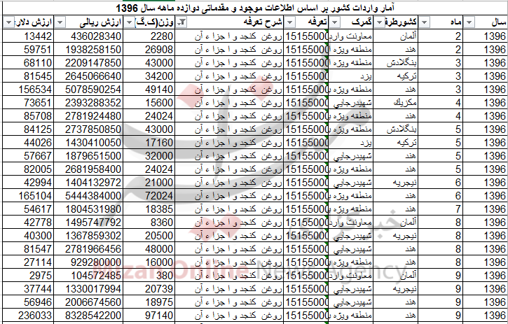 آمار مقدماتی گمرک از تجارت خارجی ۱۲ ماهه سال ۹۶ نشان میدهد که در این مدت بیش از یک میلیون و ۳۸۵ هزار و ۹۹۷ تن روغن کنجد و اجزای آن از ۶ کشور دنیا وارد ایران شده است.