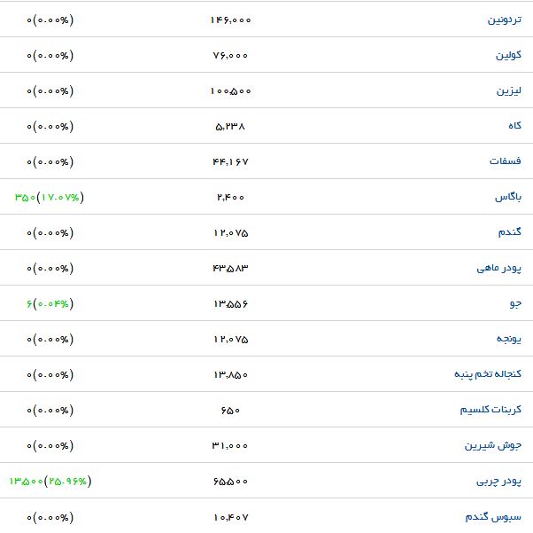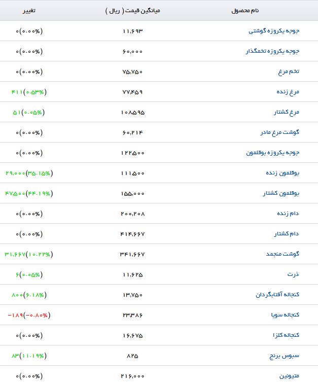 قیمت برخی نهاده های دامی و کشاورزی مانند مرغ زنده، مرغ کشتار، بوقلمون کشتار، جوجه یکروزه بوقلمون، گوشت منجمد و... امروز با افزایش نسبی مواجه شد، به طوریکه مرغ زنده با (‎0.53%‏)‎411‏ تغییر به میانگین قیمت 77,459 ریال رسید.