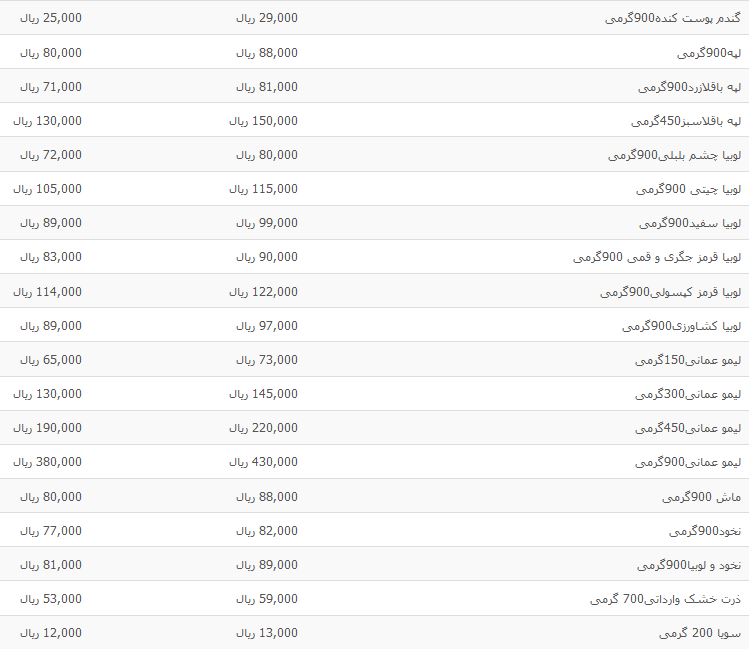 نرخ مصوب حبوبات بسته بندی شرکتی اعلام شد + جدول