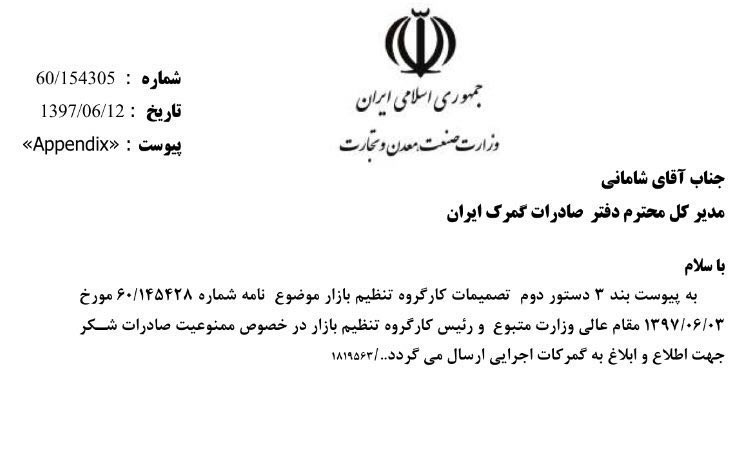بنابراین گزارش در این نامه به دلیل ممنوعیت صادرات شکر اشاره نشده است اما این تصمیم احتمالا برای تنظیم بازار داخلی و جلوگیری از صادرات و خروج بی رویه این محصول از کشور ناشی از افزایش قیمت ارز است؛ از طرفی دولت برای تولید این محصول در کشور یارانه پرداخت میکند.