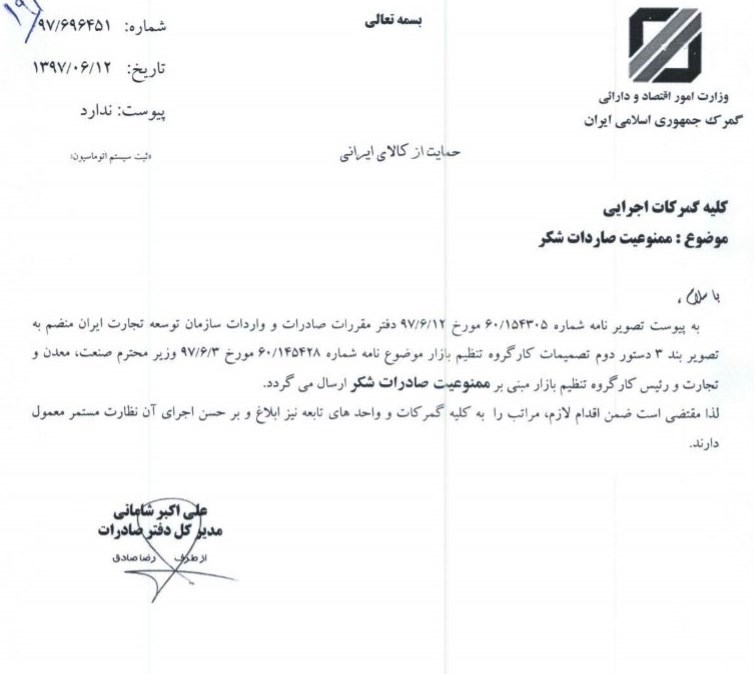 دفتر واردات گمرک ایران ممنوعیت صادرات شکر از کشور را به گمرکات اجرایی ابلاغ کرد.