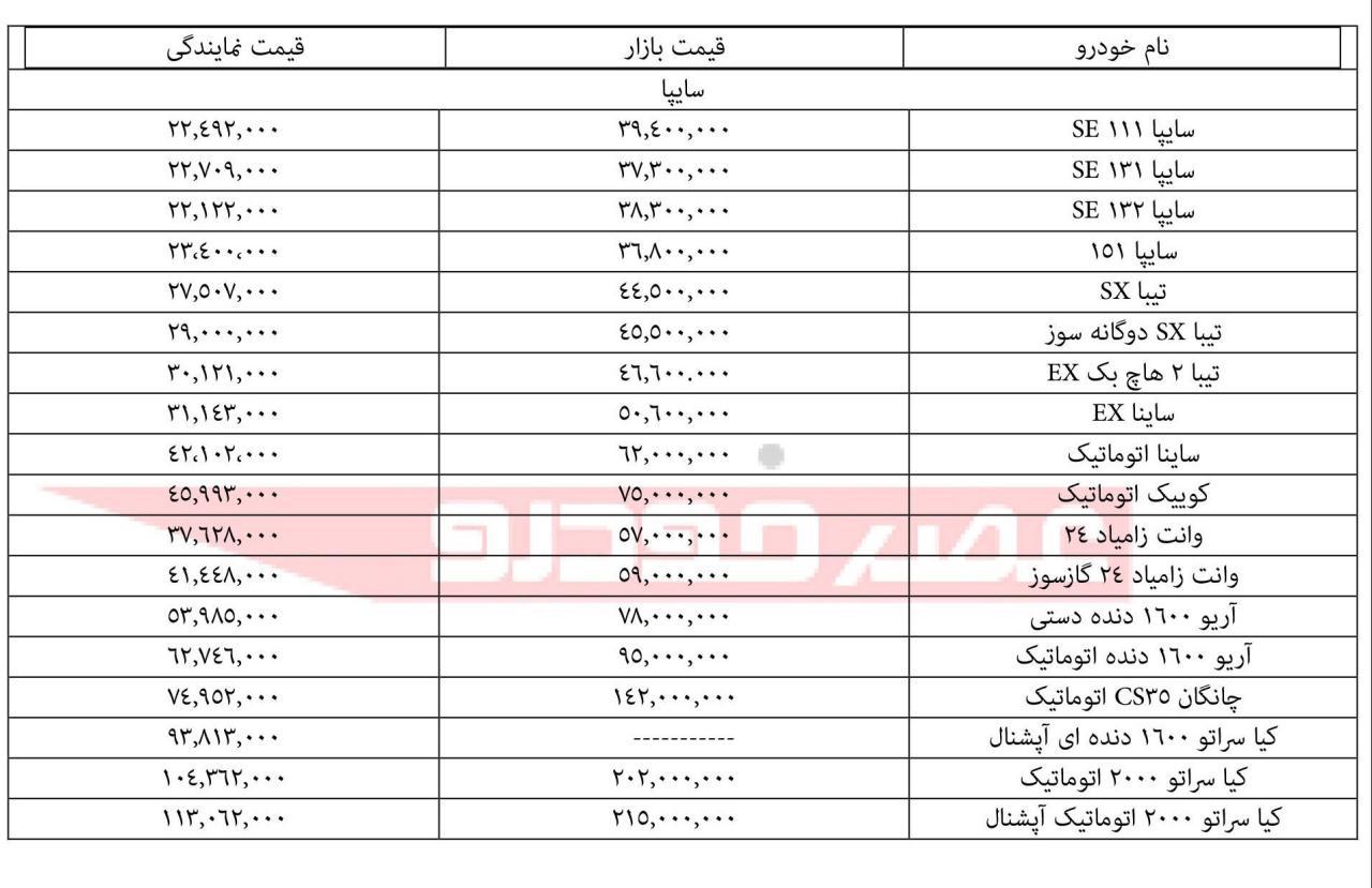 قیمت انواع محصولات سایپا ۲۴ شهریور ۹۷