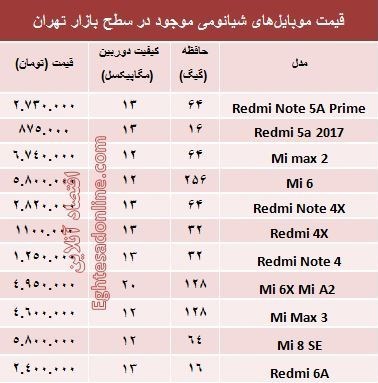 آنچه در زیر میآید قیمت انواع موبایلهای شیائومی وجود در سطح بازار تهران است.