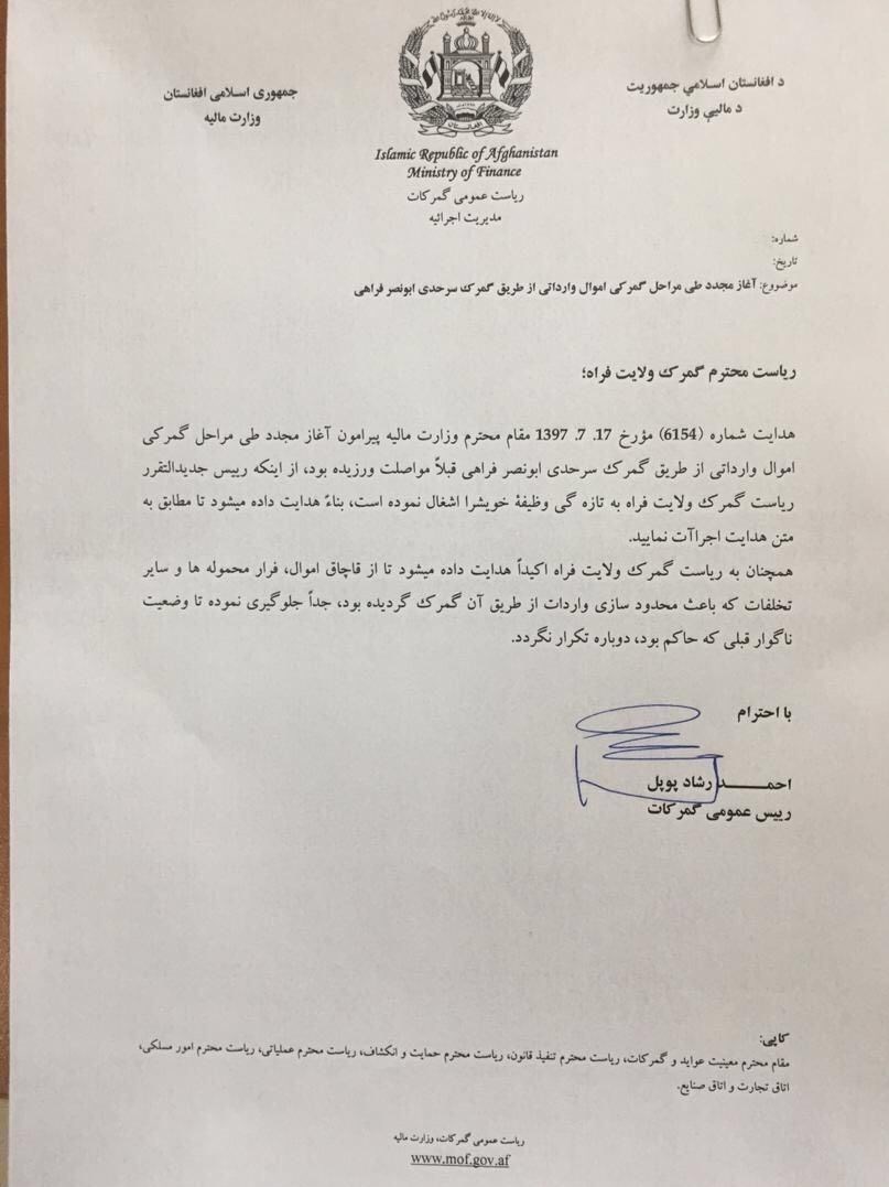 با دستور ویژه رئیس گمرکات افغانستان ممنوعیت صادرات برخی کالاهای ایرانی به ولایت فراه افغانستان رسما لغو شد؛ همچنین گمرک افغانستان بر لزوم روان سازی صادرات قانونی به این کشور تاکید کرده است تا از ورود غیر قانونی و قاچاق جلوگیری شود.