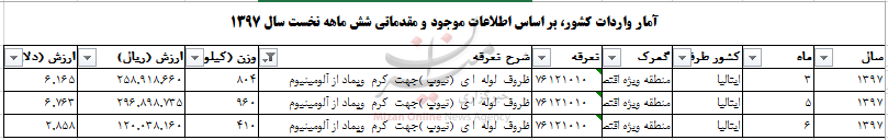 آمار مقدماتی گمرک از تجارت خارجی ۶ ماهه نخست سال ۹۷ نشان میدهد که در این مدت بیش از ۲ تن تیوپ کرم و پماد از آلومینیوم از یک کشور جهان وارد ایران شده است.