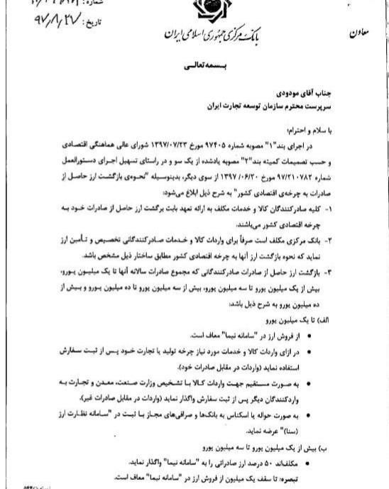 معاونت ارزی بانک مرکزی در بخشنامهای نحوه بازگشت ارز حاصل از صادرات به چرخه اقتصادی کشور را ابلاغ کرد، در این بخشنامه تمام صادرکنندگان مکلف به ارایه تعهد برگشت ارز هستند و بانک مرکزی مکلف است صرفاً برای واردات کالا و خدمات صادرکنندگانی تأمین ارز کند که نحوه بازگشت ارز به چرخه اقتصادی مطابق ساختار تعیینشده در دستورالعمل این بانک باشد.