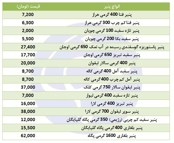قیمت انواع پنیر در فروشگاه های زنجیره ای به شرح زیر است: