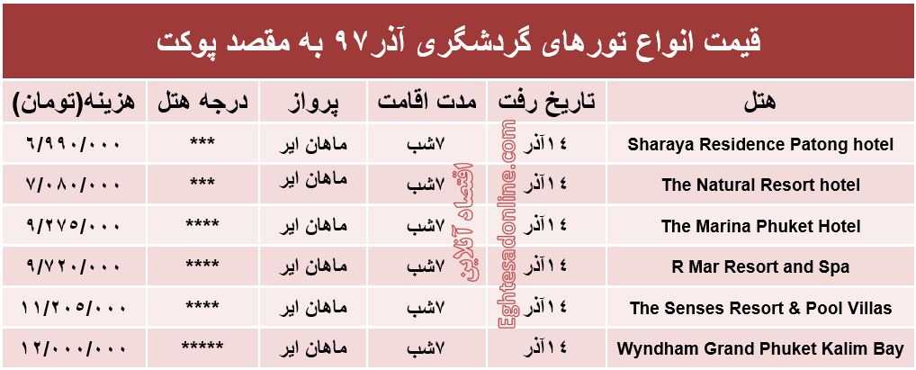 خبرفوری اقتصادی بازار و تجارت ۸ آذر ۱۳۹۷ ۱۲:۳۷ ۷شب اقامت در پوکت تایلند چقدر آب میخورد؟ قیمت انواع تورهای گردشگری به مقصد پوکت در آذر ماه۹۷ به شرح جدول زیر است. کپی شد کدخبر: 719974 ت ت 728 گردشگری قیمت بازار کپی شد با دوستان خود به اشتراک بگذارید: