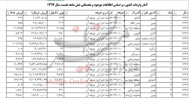 بنا بر آمار منتشره از سوی گمرک بیشترین واردات از کشور چین با وزن بیش از ۲۳۴ تن و ارزش دلاری ۶۳۷ هزار و ۲۰۹ دلار صورت گرفته است.