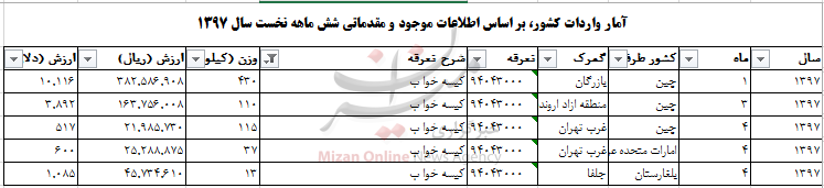 بر اساس این گزارش، واردات کیسه خواب از کشورهای چین، امارت، بلغارستان بوده است.