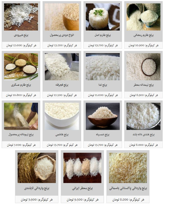 قیمت انواع برنج ایرانی با اندکی افزایش همراه شد. هر کیلو برنج طارم رمضانی با مبلغ ۱۰ هزار و ۹۰۰ تومان در میادین میوه و تره بار به فروش میرسد.