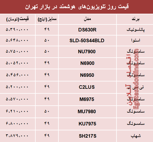 آنچه در زیر میآید جدول قیمت روز پرفروشترین انواع تلویزیون هوشمند در سطح بازار تهران است.