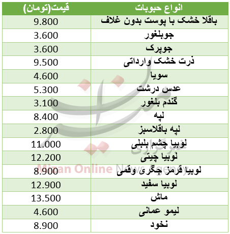 نرخ انواع حبوبات غیر شرکتی در میادین میوه و تره بار به شرح زیر است: