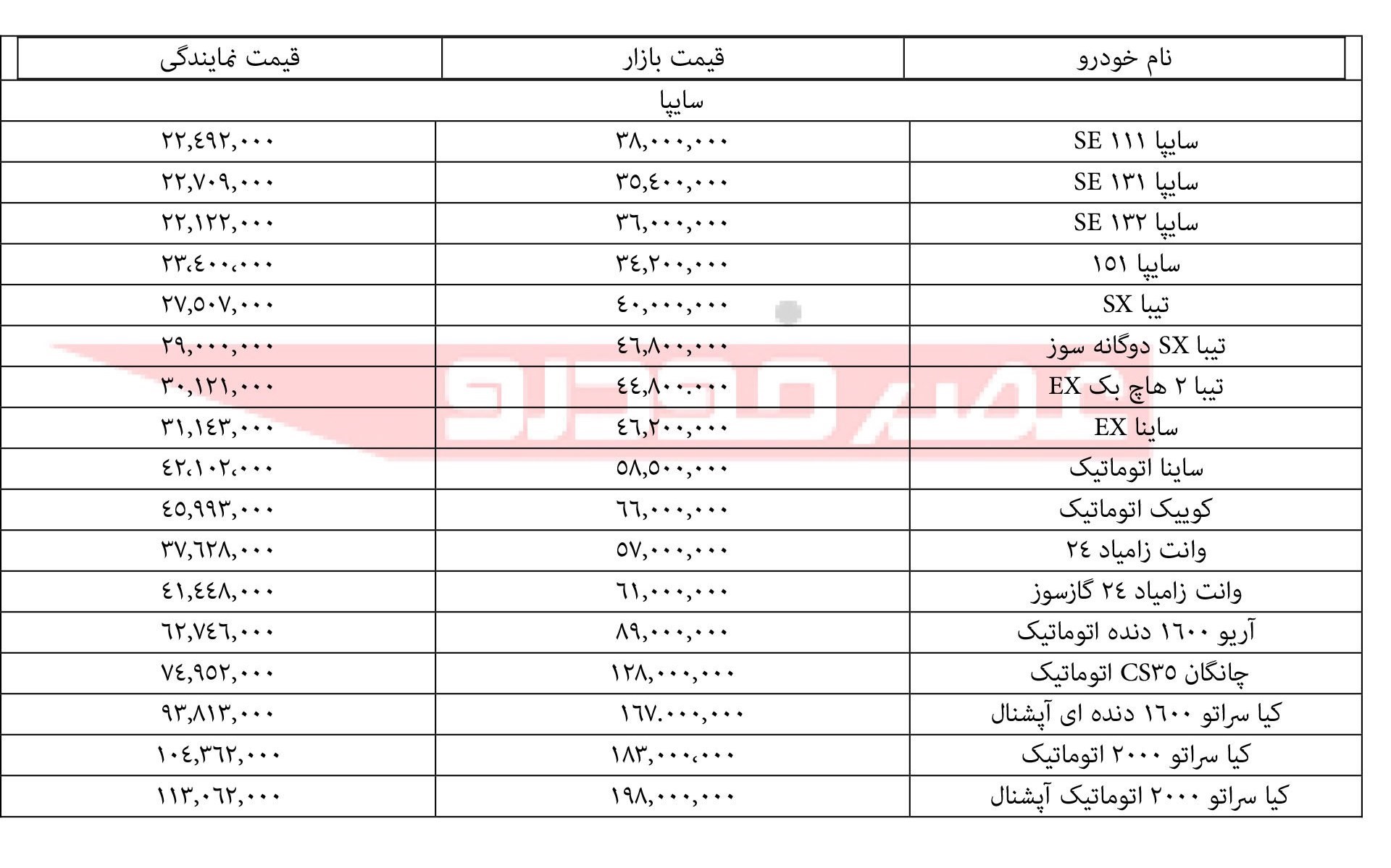 قیمت انواع محصولات سایپا در بازار و نمایندگی به شرح زیر است: